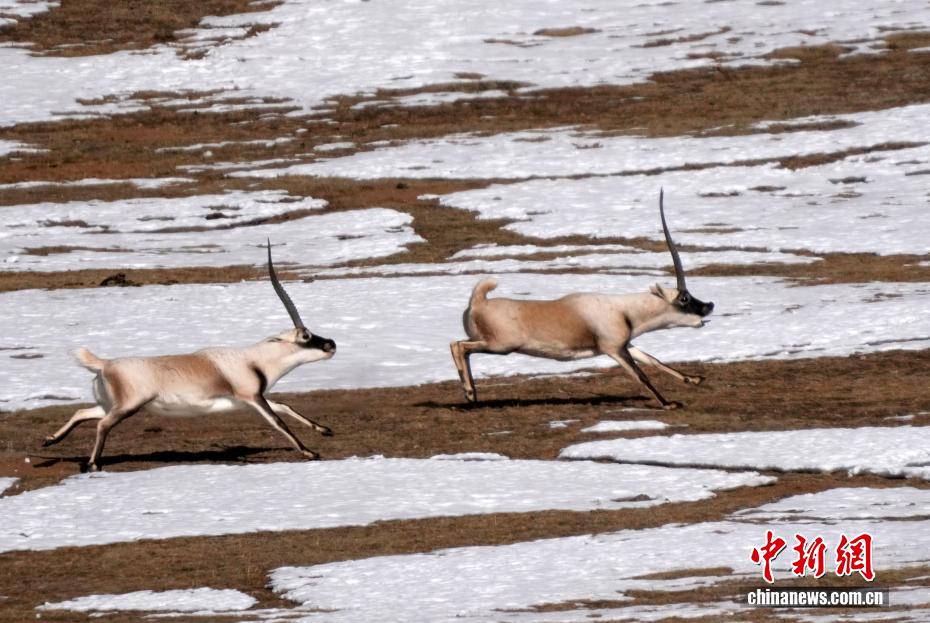 12月19日,西藏那曲市申扎县境内栖息的藏羚羊群。在藏北高原腹地的雪原或草原上,藏羚羊群或追逐打斗,或低头觅食,展现着冬日高原的勃勃生机。图为藏羚羊追逐打斗。中新社记者 李林 摄