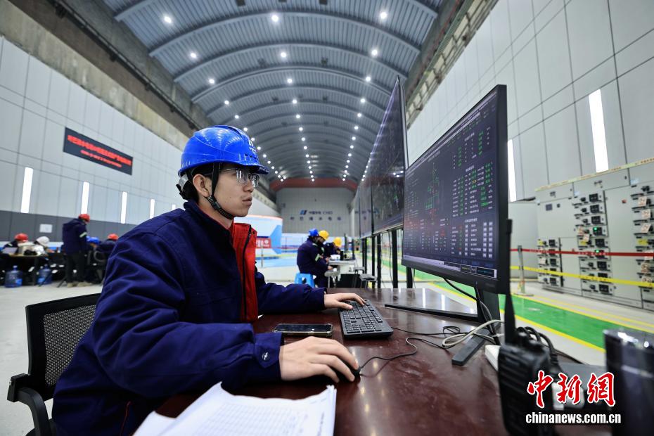 12月27日,中国在建海拔最高双曲拱坝电站——叶巴滩水电站首批机组正式投产发电。叶巴滩水电站位于四川省甘孜州白玉县与西藏自治区贡觉县交界的金沙江干流上。水电站总装机容量224万千瓦,此次首批投产发电的机组为4号和3号机组。图为12月27日,工作人员在现场监测机组运行状态及各项参数。中新社记者 王磊 摄