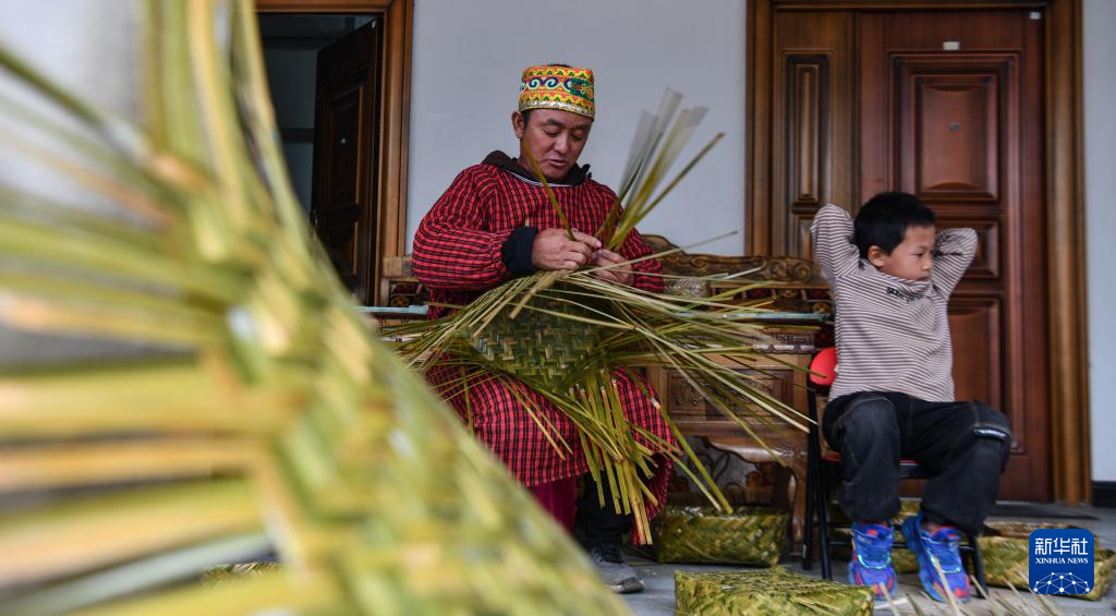 巴登村村民新向东在家编织竹筐(2022年4月15日摄)。新华社记者 晋美多吉 摄