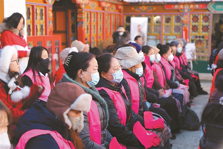 图为拉萨市妇联志愿者参加城乡环境综合大整治行动动员会。