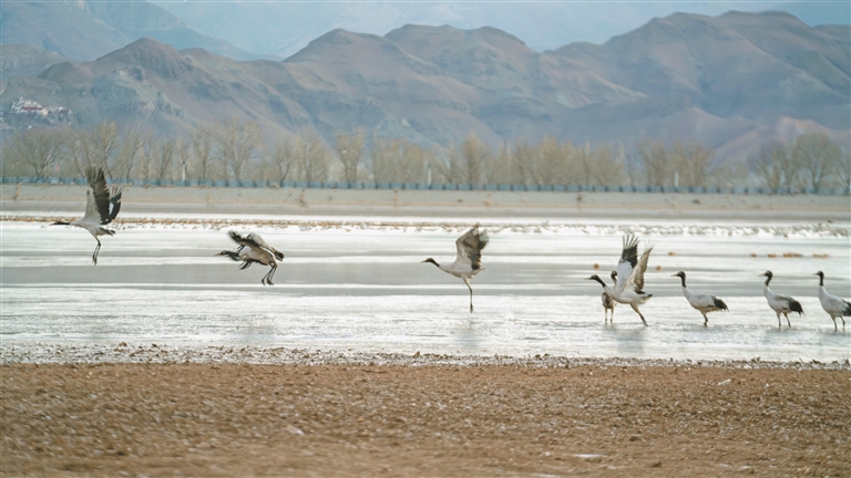 1月17日,天还未亮,拉萨市林周县卡孜水库的上空便回荡着黑颈鹤的鸣唱。