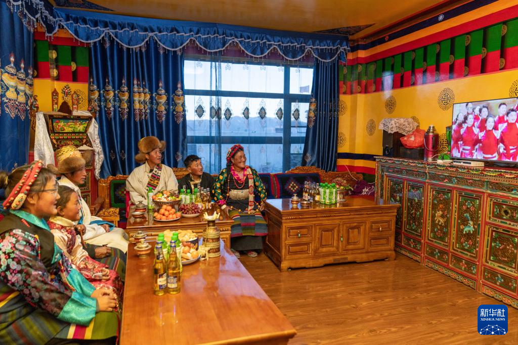 2月16日,长所乡古荣村村民桑杰一家在新居里观看春晚。新华社记者 旦增尼玛曲珠 摄