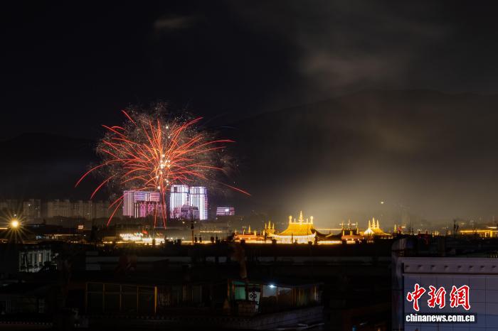 藏历新年是西藏传统民俗活动,也是中国国家级非物质文化遗产。2月16日是农历除夕,在拉萨,藏族百姓也迎来了一年中最重要的节日之一——藏历新年的“古突”夜(类似春节的除夕)。如今的“古突”夜,拉萨民众在点燃象征驱邪祈福的火把时,也会燃放绚丽的烟花,璀璨的光华照亮了这座古城的夜空。图为2月16日晚,高原古城拉萨烟花烂漫。中新社记者 江飞波 摄