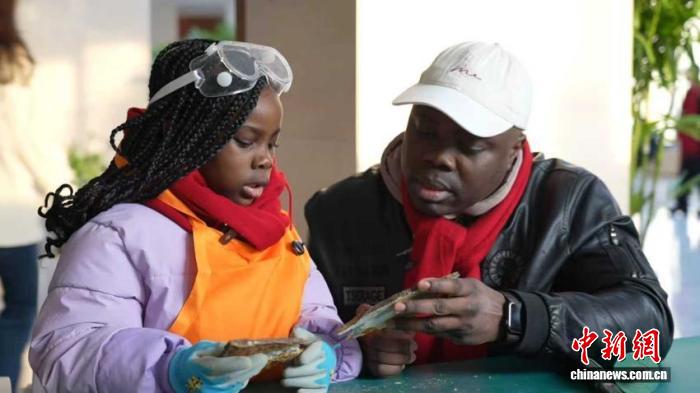 2月27日,来自尼日利亚约瑟夫(右)和女儿在辽宁朝阳鸟化石国家地质公园化石体验区亲手“开化石”。 韩浩天 摄