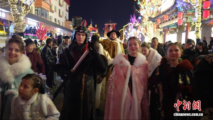 2月27日晚,身着各式传统服饰的海外友人穿行于辽宁朝阳慕容街。 韩浩天 摄