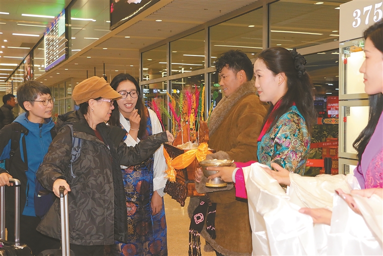 当首批香港游客走出机场时,悠扬的歌声响起,艺术团成员迎上前,向每一位远道而来的客人敬献哈达。