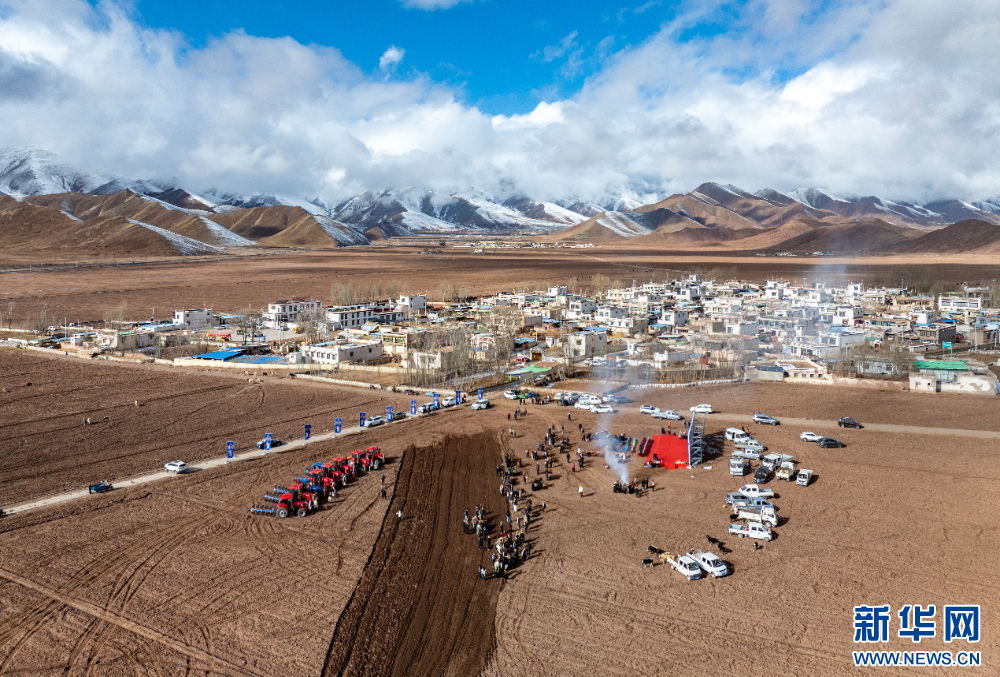 3月16日,西藏拉萨市林周县春堆乡春堆村的春耕仪式现场(无人机照片)。新华网 旦增努布 摄