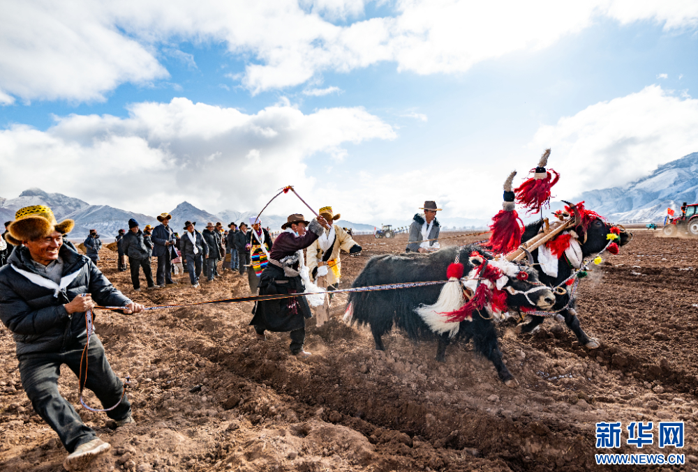 3月16日,在西藏拉萨市林周县春堆乡春堆村春耕仪式上,当地群众按照传统的“二牛抬杠”耕作方式翻土犁地,开启春耕第一犁。新华网 旦增努布 摄