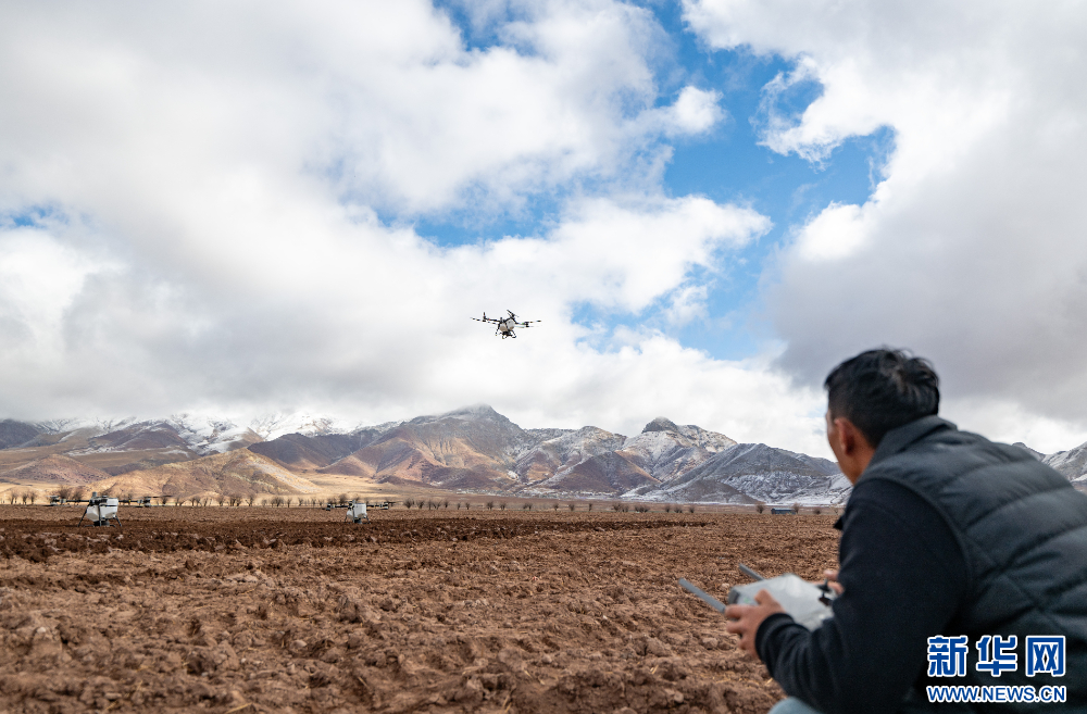 3月16日,西藏拉萨市林周县春堆乡春堆村群众在春耕仪式上操作无人机。新华网 旦增努布 摄