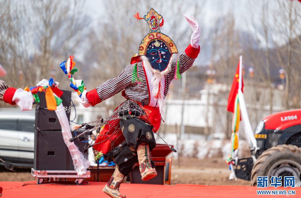 3月16日,西藏拉萨市林周县春堆乡春堆村村文艺队在春耕仪式上表演藏戏。新华网 旦增努布 摄