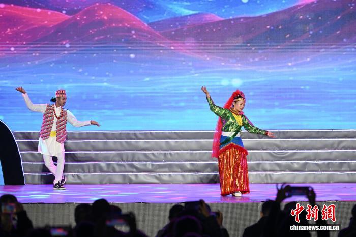 4月3日,西藏林芝市第二十三届桃花旅游文化节开幕式文艺演出在林芝市工布公园圆满举行。本次演出以雪域江南自然风光为底色,以工布民俗文化为内核,通过精彩纷呈的文艺展演,全面展现林芝独特的生态之美、人文之韵、发展之盛,奏响了文旅融合、民族团结、奋进发展的春日乐章。图为开幕式的文艺表演尼泊尔民间歌舞《同心万里》。中新社记者 贡嘎来松 摄