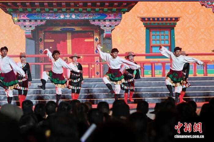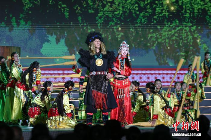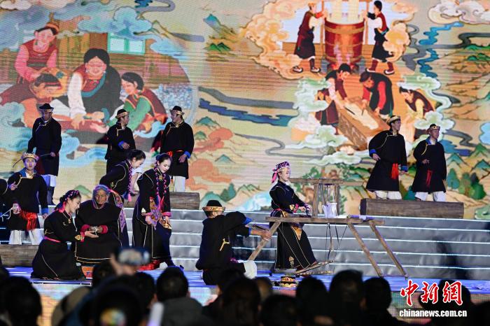 4月3日,西藏林芝市第二十三届桃花旅游文化节开幕式文艺演出在林芝市工布公园圆满举行。本次演出以雪域江南自然风光为底色,以工布民俗文化为内核,通过精彩纷呈的文艺展演,全面展现林芝独特的生态之美、人文之韵、发展之盛,奏响了文旅融合、民族团结、奋进发展的春日乐章。图为开幕式上的文艺表演非遗歌舞《工布遗韵》。中新社记者 贡嘎来松 摄