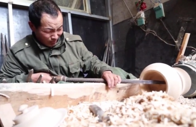 图为拉郊乡村民在制作木器