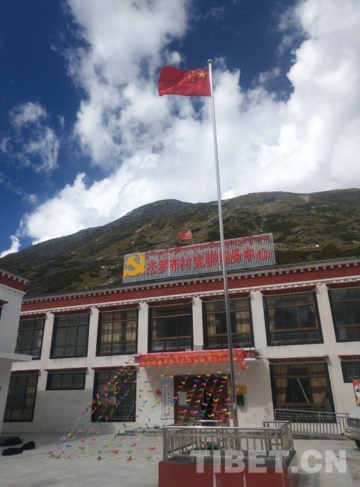图为杰罗布村迎风飘扬的五星红旗