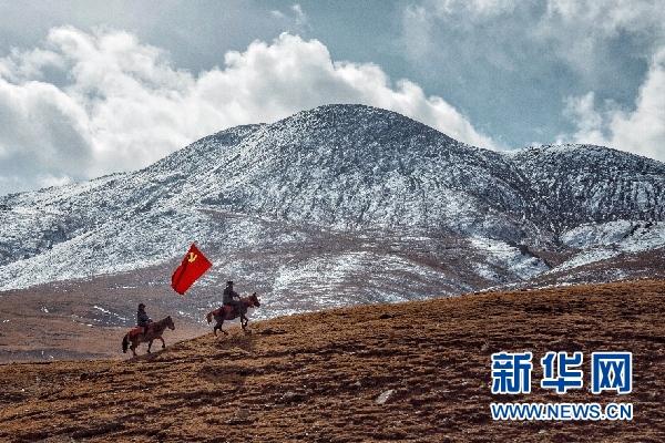 党的十九大胜利闭幕以来,全国各地广大干部群众以各种形式,通过全方位、多维性、灵活多样的方式进行学习宣讲、积极传播党的理论,输送社会正能量,这就是摄影作品《雪域旌旗》所讲述故事的背景。