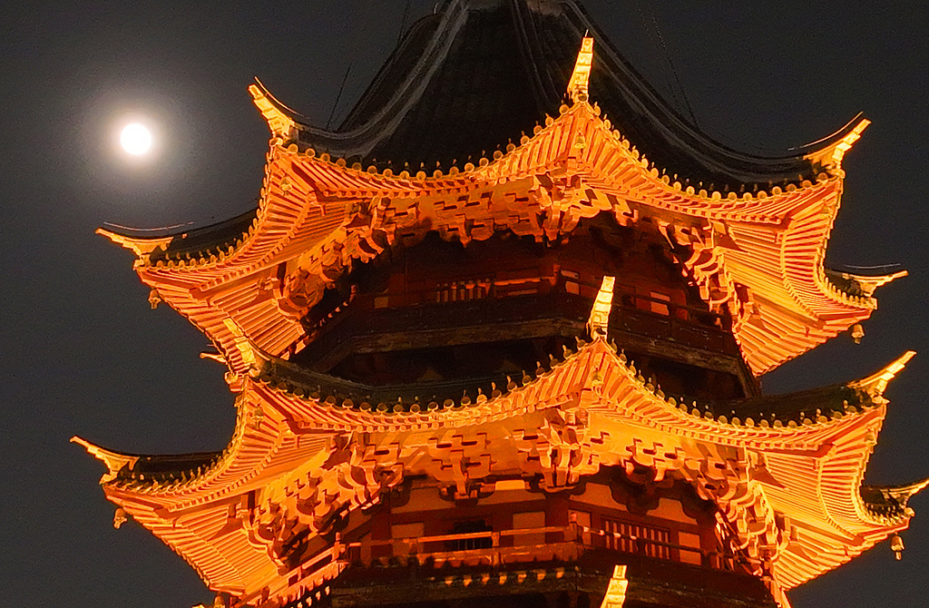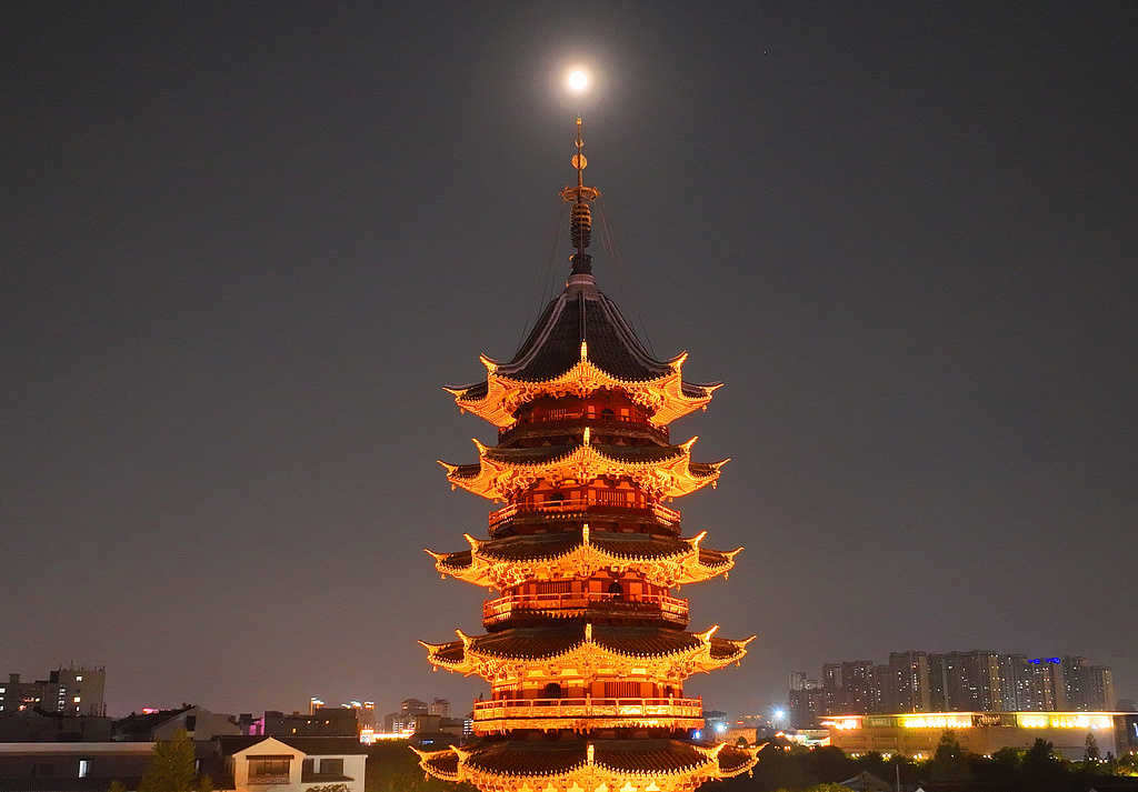 江苏苏州古城夜空一轮中秋明月与千年瑞光塔交相辉映。