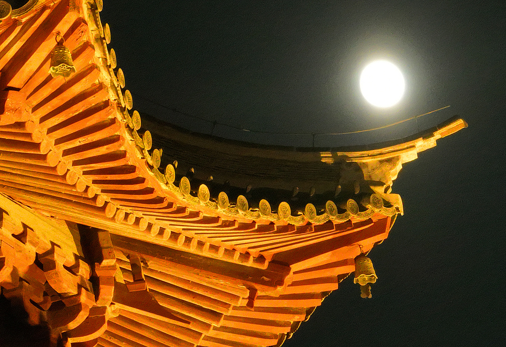 北京,夜幕降临,一轮圆月现身夜空,偶有彩云相伴。圆月与故宫角楼、角楼脊兽同框,仿佛穿越古今。