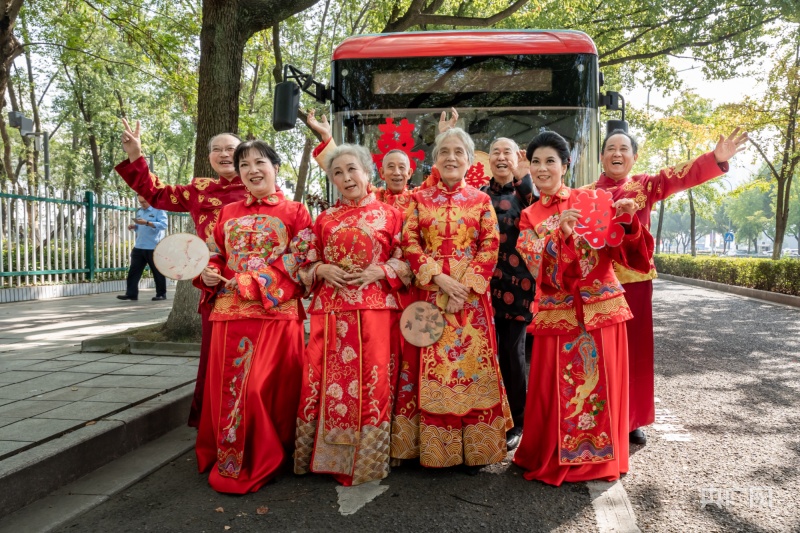 “我那个时候上班经常坐公交车,冬天天黑得快,老头子总会在车站等我,公交车站有很多我们的回忆,能够在公交车上拍婚纱照我们觉得很有意义。”蔡佩英回忆着当时的情景,动情地说着。城市公共交通的改变,让他们亲历城市的变迁,也见证了现在的美好生活。作为活动发起人的潘火桥社区党总支书记丁晓苹说:“我们社区多方联动积极开展关爱‘一老一小’行动,始终把落脚点放在老年人的精神慰藉与青少年的家风培育上,通过让老人拍摄婚纱照感受晚年生活的幸福,也为年轻人建立正确的婚育观作出示范。”
