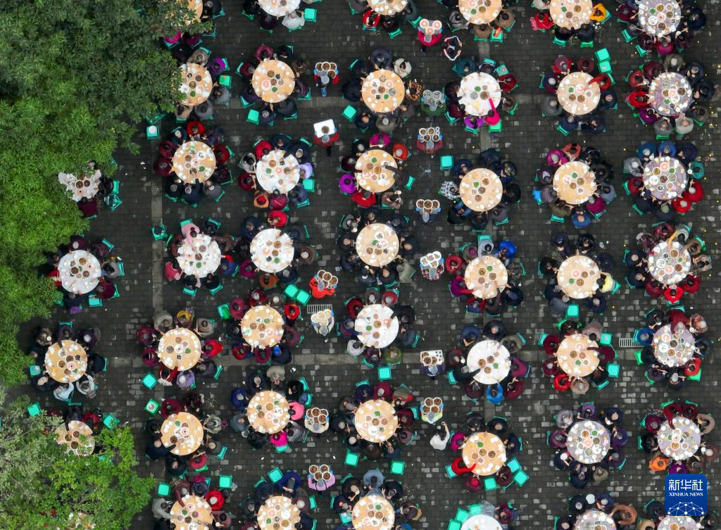10月19日拍摄的华岩镇石龙社区“长寿宴”活动现场(无人机照片)。新华社记者 刘潺 摄