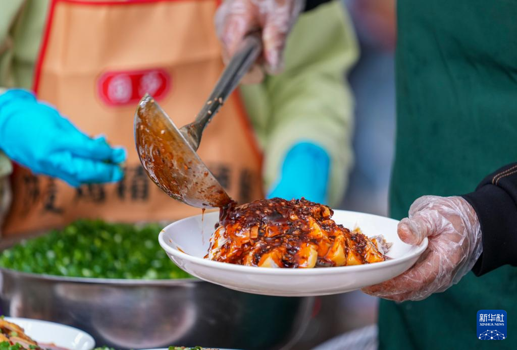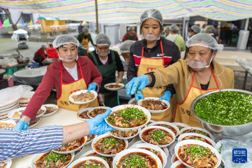 10月19日,重庆市九龙坡区华岩镇石龙社区志愿者在为参加“长寿宴”的老人们上菜。新华社记者 刘潺 摄
