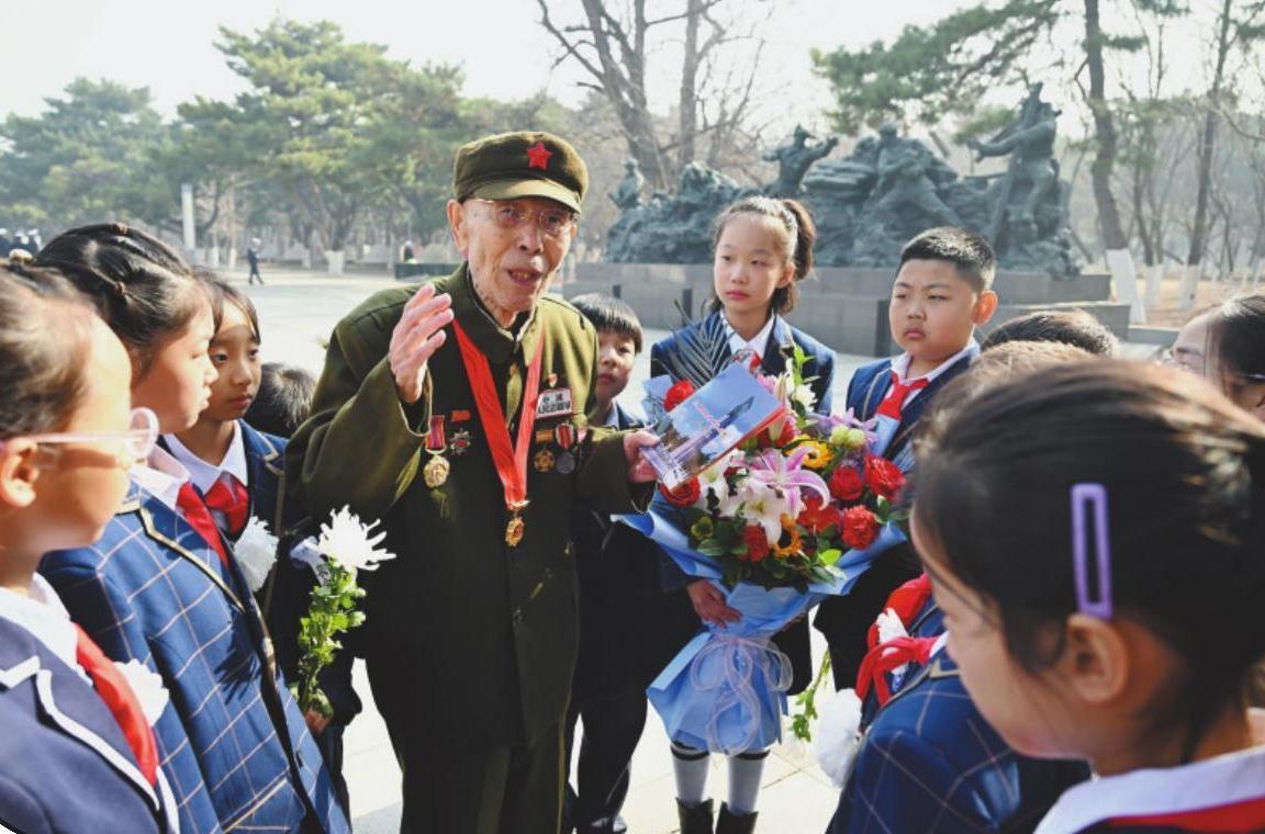 清明节临近,全省各地开展“清明祭英烈”活动。日前,沈阳市各界人士走进沈阳抗美援朝烈士陵园,祭扫献花,缅怀英雄。现场,92岁志愿军老战士金东辉为孩子们讲述抗美援朝的英雄事迹。(辽宁日报记者 赵敬东 摄)