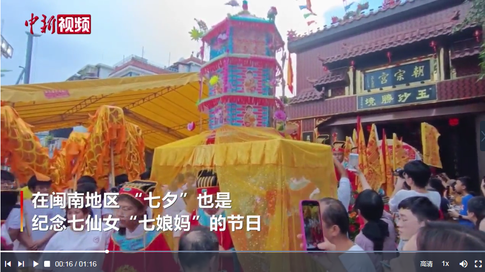 8月22日,闽南地区人生礼俗“七娘妈生做十六岁”在厦门朝宗宫举行。在闽南地区,“七夕”也是纪念七仙女“七娘妈”的节日,孩子年满16岁时,家长要举行成年仪式,答谢七娘妈的护佑。少年们穿状元服过平安桥、成年门,踩街活动结束后举行成人礼,手捧清茶,孝奉尊亲。舞龙、舞狮,歌仔戏《成功颂》、金门“打花草”等两岸阵头表演也前来助兴,祝福少年们健康成长,诸事成功。