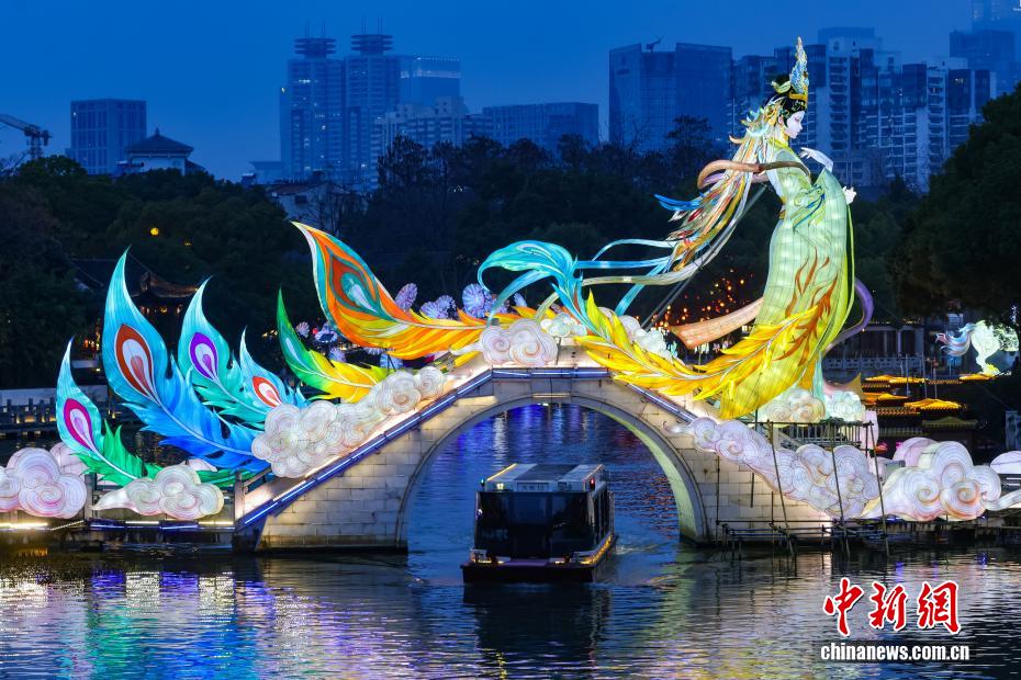 2月27日晚,江苏南京,游船从展出的大型彩灯下驶过。元宵佳节将至,古城南京流光溢彩。中新社记者 泱波 摄