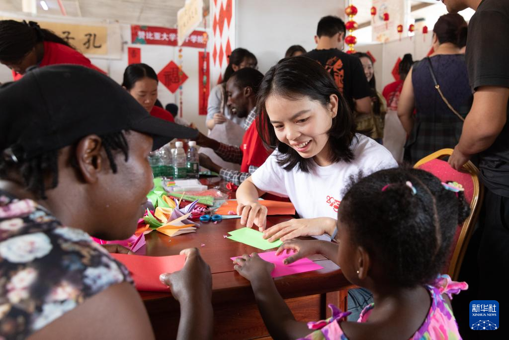 在庙会现场的赞比亚孔子学院展位前,人头攒动。包括书法体验、剪纸、折纸展示和猜字谜等丰富的文化互动项目,吸引人们纷纷参与体验。一位赞比亚妈妈带着孩子在老师指导下完成她的第一个中国结作品,她高兴地说:“原来中国艺术这么有趣!希望我的孩子有一天可以去孔子学院学习。”