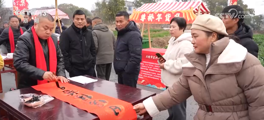 在江西上饶市广信区尊桥乡,年货市集人头攒动。摊位上年货品类丰富,当地的书法爱好者现场写春联、送福字,墨香四溢。