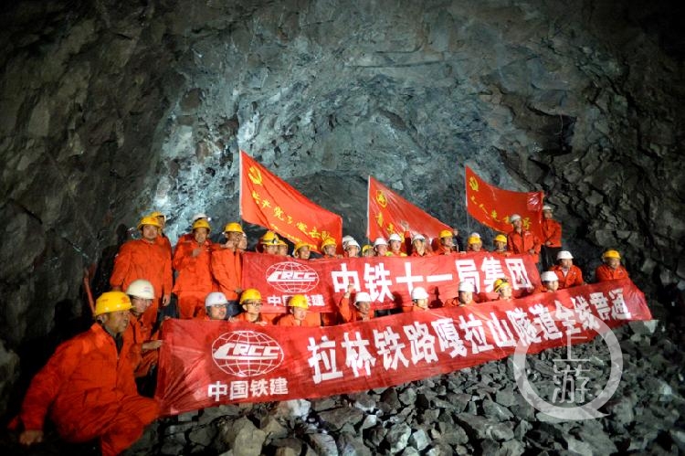 图为川藏铁路拉林段嘎拉山隧道全线贯通,全体员工在隧道内欢呼合影。图片来源:上游新闻 记者 鞠芝勤 周本帅 邹飞 通讯员 侯利 安永军 摄影报道