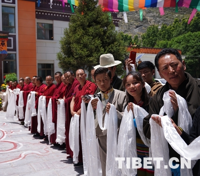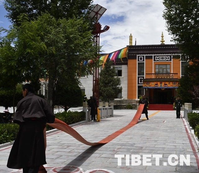 当大院内响起法号声时,早已在此等候的僧俗信教群众纷纷翘首踮足,盼望一睹十一世班禅的风采。十一世班禅刚下车,高僧们手持香炉,打着幡幛、华盖,吹奏佛乐,以藏传佛教最隆重的礼仪迎接班禅额尔德尼•确吉杰布的到来。身着藏族传统盛装的男女青年,向十一世班禅敬献象征吉祥如意的“切玛”,表达拉萨各族各界人士和僧俗信教群众的美好祝愿。在此等候的自治区有关领导也与十一世班禅互敬哈达、互致问候。