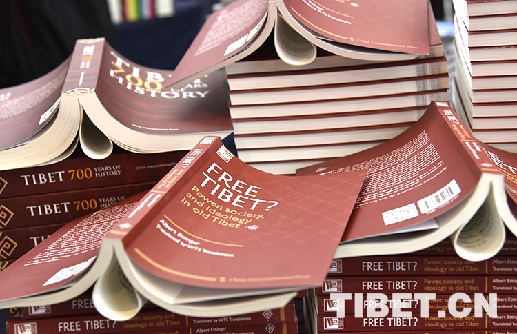 图为“2019•中国西藏发展论坛”展示的艾廷格发表的研究性著作《自由西藏?——还原喇嘛教统治下的国家、社会和意识形态》 摄影:王媛媛