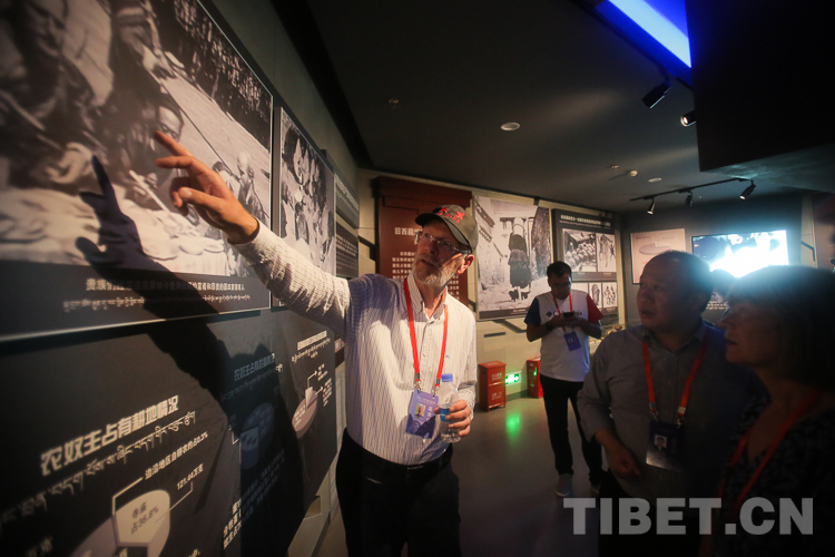 图为6月13日,艾廷格(左一)参观西藏百万农奴解放纪念馆摄影:赵耀