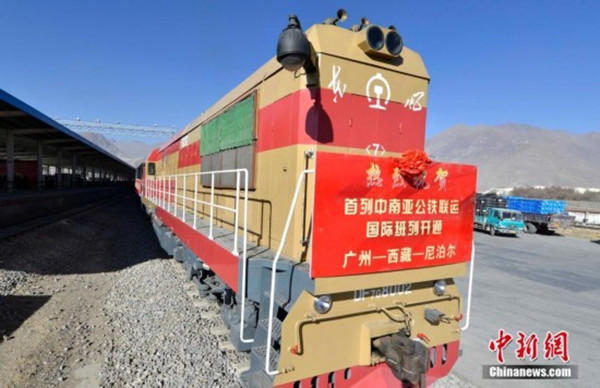 图为2016年12月5日,首列中南亚公铁联运国际班列缓缓驶入拉萨市。