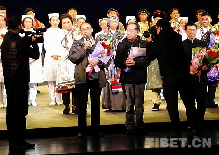 由唐召明等人策划的评剧《藏地彩虹》在全国地方戏演出中心演出,深受好评。这是唐召明在演出后谈创作感受。该剧援藏医生方丹的原型是唐召明长期报道的、被藏族称为“活菩萨”的北京安贞医院小儿心脏病专家顾虹。(唐召明提供,2017年12月10日摄)