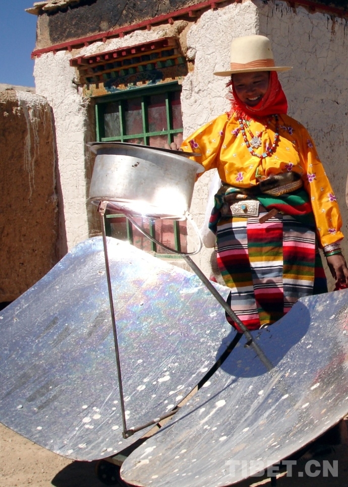 在藏北高原,现在随处可见城镇里的一个个太阳能路灯、一栋栋太阳能采暖楼和采暖房,一排排房顶上斜立着的太阳能热水器,就连牧民家也常常可以看到安放在窗前、屋顶和院内的电池板、太阳灶。利用太阳能烧水做饭和发电照明,既方便又干净,老天爷还不收燃料费。