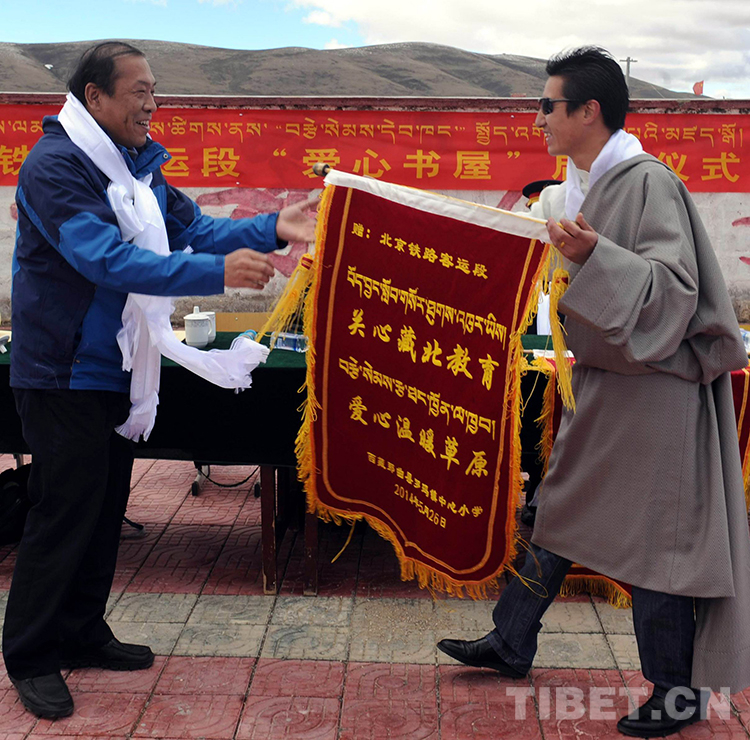 这是西藏那曲地区那曲县(现那曲市色尼区)罗玛镇中心小学校长拉巴格桑(右)代表学校向北京铁路客运段代表王博轩(左)赠送锦旗(唐召明2014年5月29日摄)