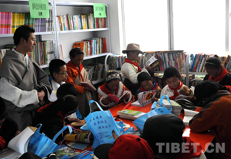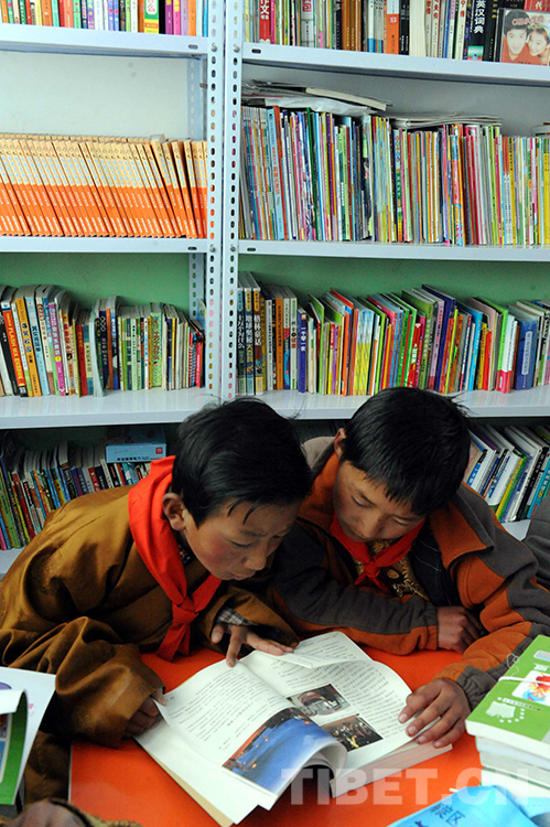 这是西藏那曲地区那曲县(现那曲市色尼区)罗玛镇中心小学学生在新建的“爱心书屋”快乐地读书(唐召明2014年5月29日摄)