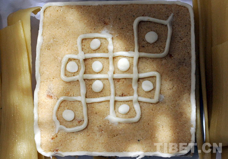 这是使用酥油、奶渣等混合制成的食品“褪”。它类似年糕,酥软香甜可口(唐召明2013年7月25日摄)