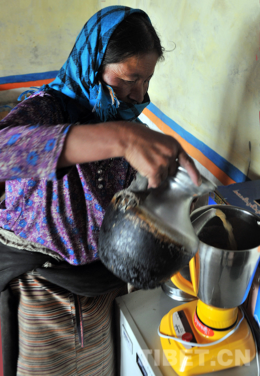 这是班戈县新吉乡术后的斯求卓玛向放入酥油的电动搅拌壶里倒茶水,准备用电来打制酥油茶(唐召明2015年7月14日摄)