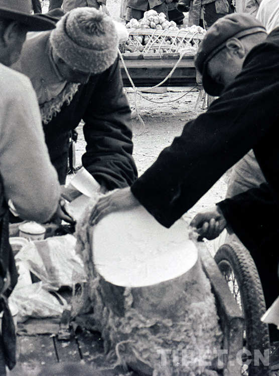 这是在藏北首府那曲镇市场上,正在售卖的大坨酥油(唐召明1989年摄)