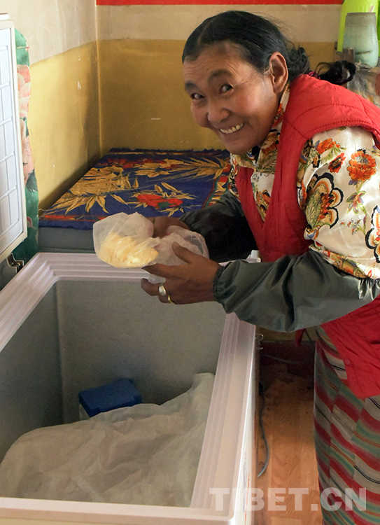 这是双湖县嘎措乡牧女次仁朗加,使用家里的冰柜冷藏随用随取的酥油(唐召明2019年9月20日摄)