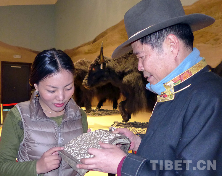这是吴雨初在向负责展品管理的藏族女儿桑旦拉卓介绍牦牛皮挎包的制作方法(唐召明提供,2015年3月27日摄)