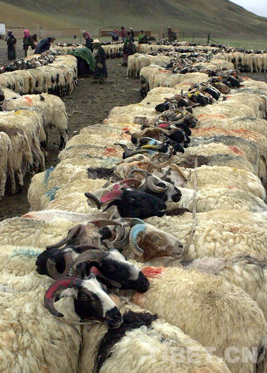 这是藏北双湖特别区(现双湖县)嘎措乡牧人用绳子统一拴住羊群角后,准备挤羊奶。该乡是西藏唯一的一个走集体化经营道路的乡村(唐召明2001年摄)