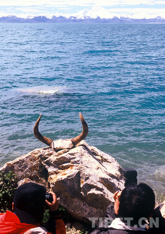 这是游客在拍摄纳木错和远处绵延的念青唐古拉山美景(唐召明2001年摄)