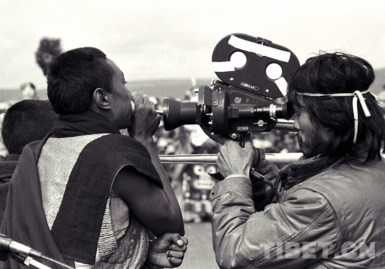 这是北京科学教育电影制片厂《万里藏北》摄制组导演忻迎一,在那曲赛马会上拍摄吹长号的僧人(唐召明1988年摄)
