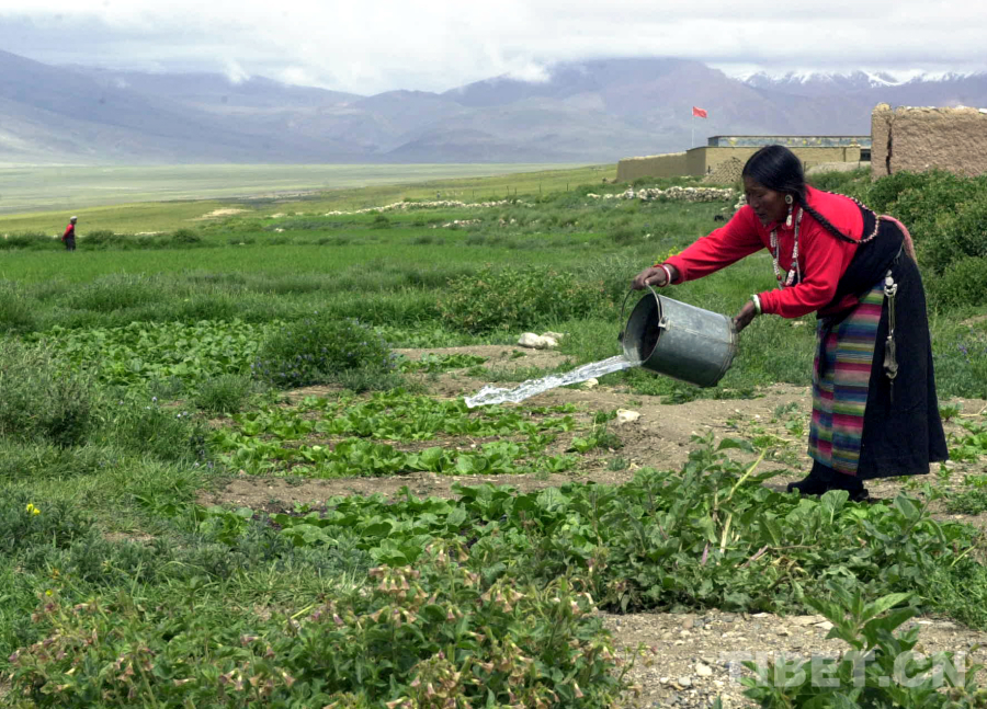 这是在尼玛县文部乡南村的当惹雍错湖畔,一位藏族妇女在为蔬菜浇水(唐召明2001年摄)