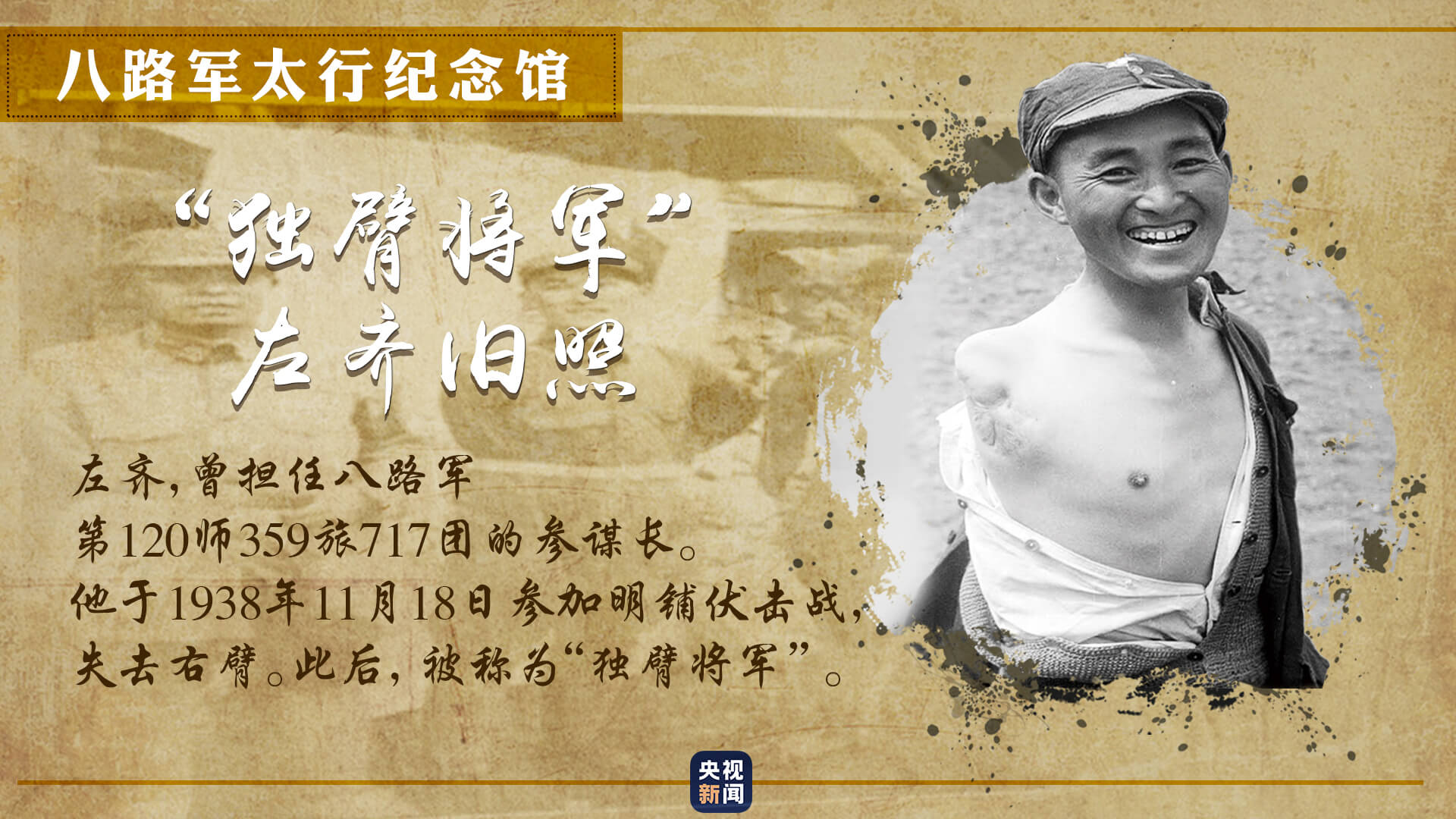 一张独臂将军的旧照,展现出八路军为争取民族独立,不怕牺牲、不畏艰险的革命英雄主义精神。