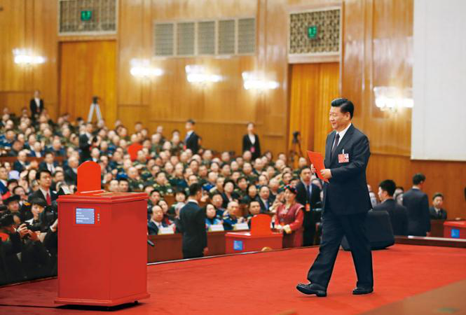 2018年3月17日,十三届全国人大一次会议在北京人民大会堂举行第五次全体会议。习近平当选中华人民共和国主席、中华人民共和国中央军事委员会主席。这是习近平准备投票。新华社记者 兰红光/摄