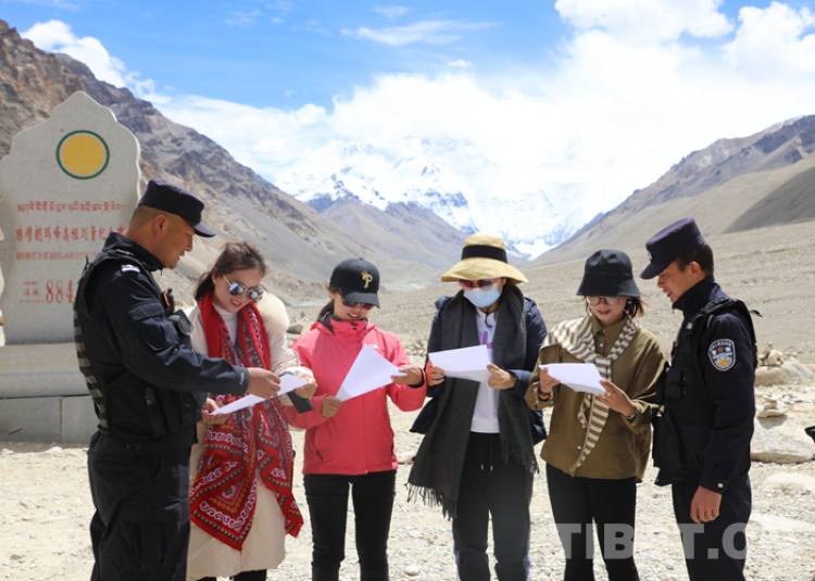 图为珠峰边境派出所民警在珠峰大本营执勤点向游客开展生态环境保护宣传 摄影:毕琦